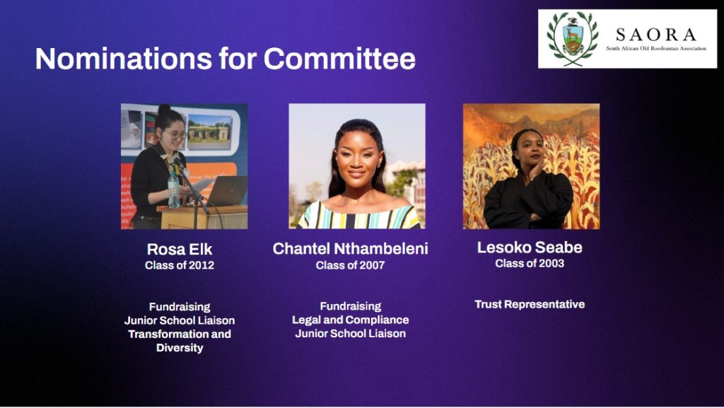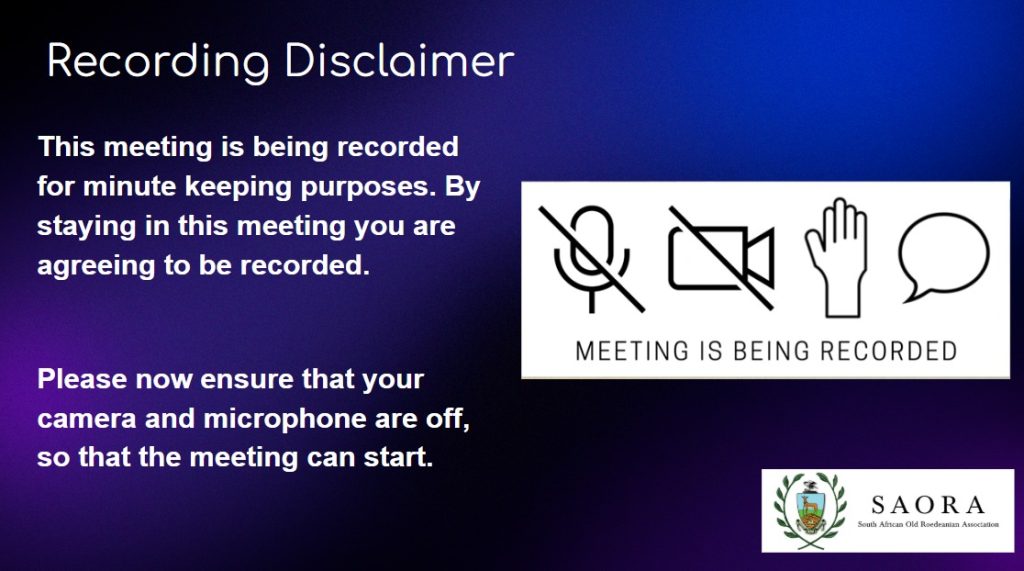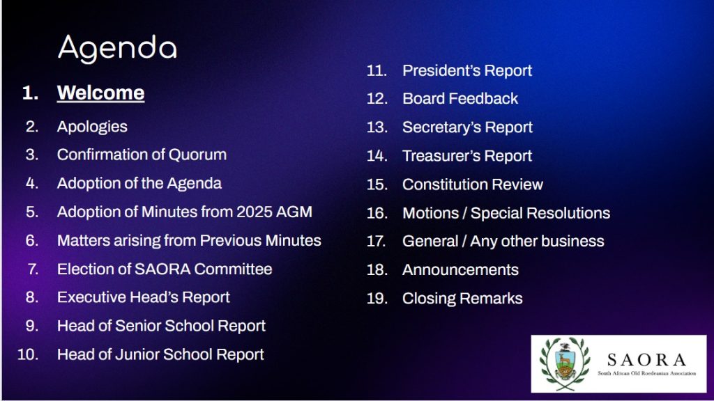 Letter from SAORA President dated 9 March including details for the SAORA Annual General Meeting. Click here to view the AGM Letter. Kindly email saora@roedeanschool.co.za to request the link to the online meeting.