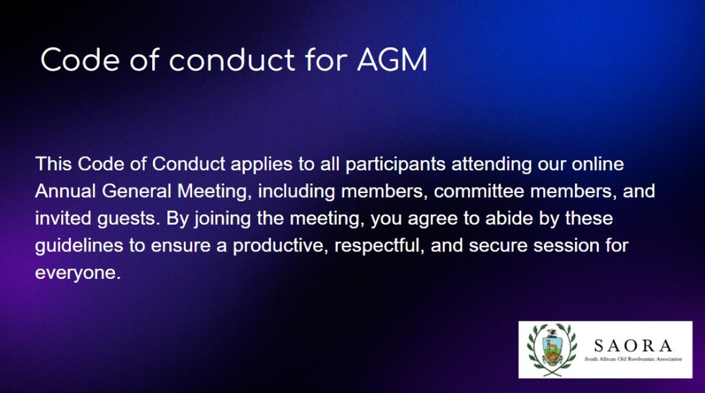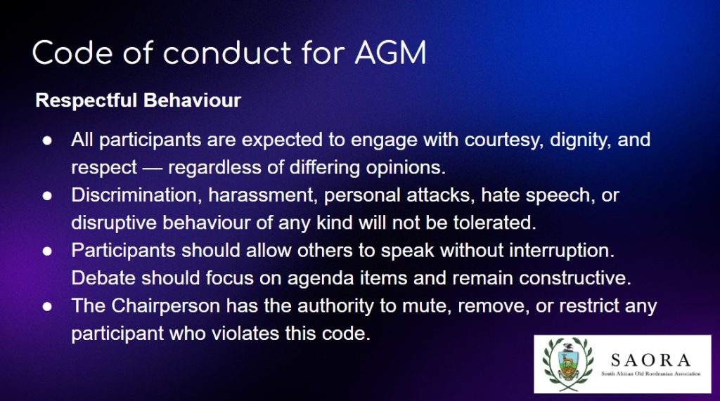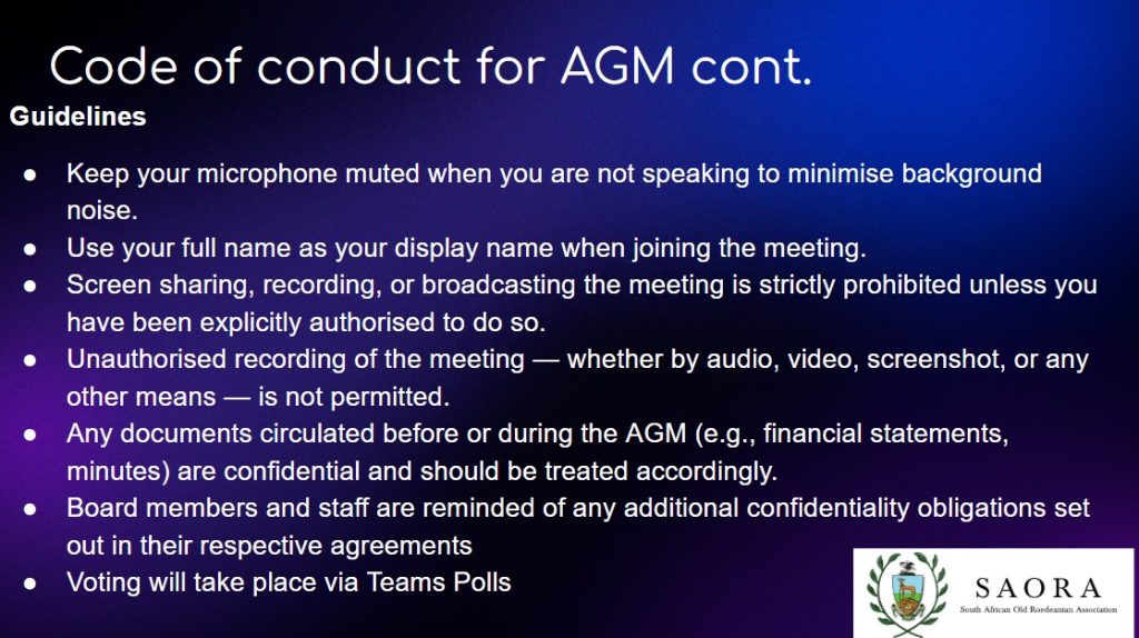 Agenda, Code of Conduct for AGM, Nominations and Recording Disclaimer posted on 28 March 2026 for the SAORA Annual General Meeting.
